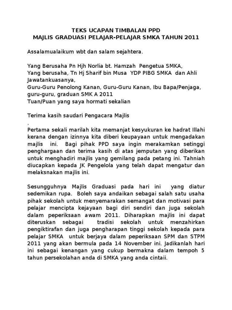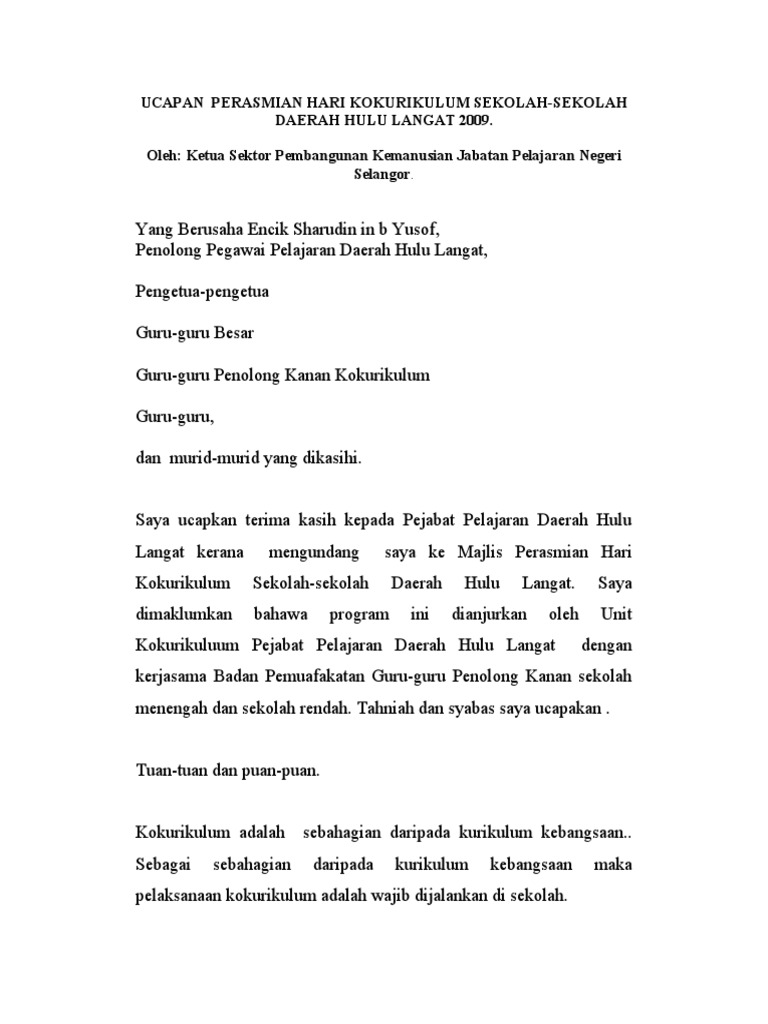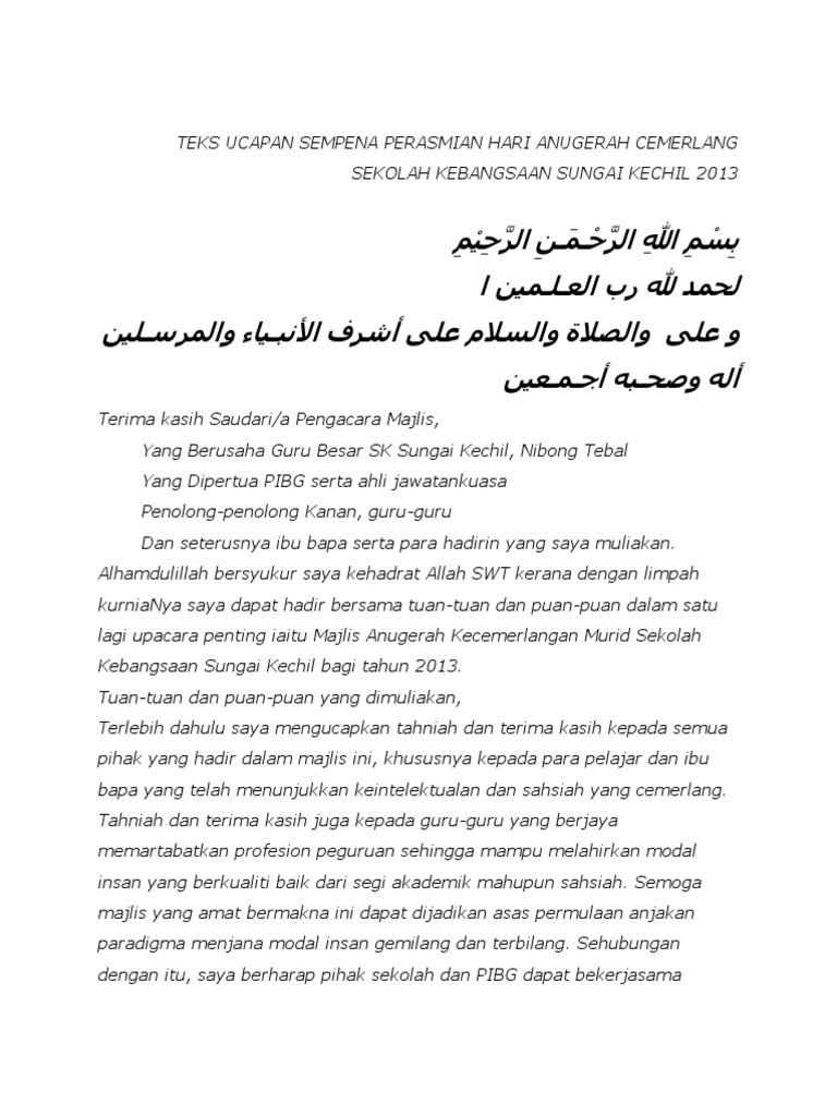 Teks ucapan hari anugerah koko 2012. Contoh teks ucapan perasmian sekolah oleh ydp pibg hari anugerah cemerlang hac sekolah rendah 2013 by salfinazb in types and hac sekolah rendah ydp pibg. Teks ucapan ketua pengawas hari graduasi. Kecemerlangan pelajar mencerminkan perkembangan serta kemajuan sekolah, dalam melahirkan modal insan dan seterusnya membuktikan. Disini akan saya share contoh teks pembawa acara (mc) peresmian (tasyakuran) selesainya pembangunan musholla.