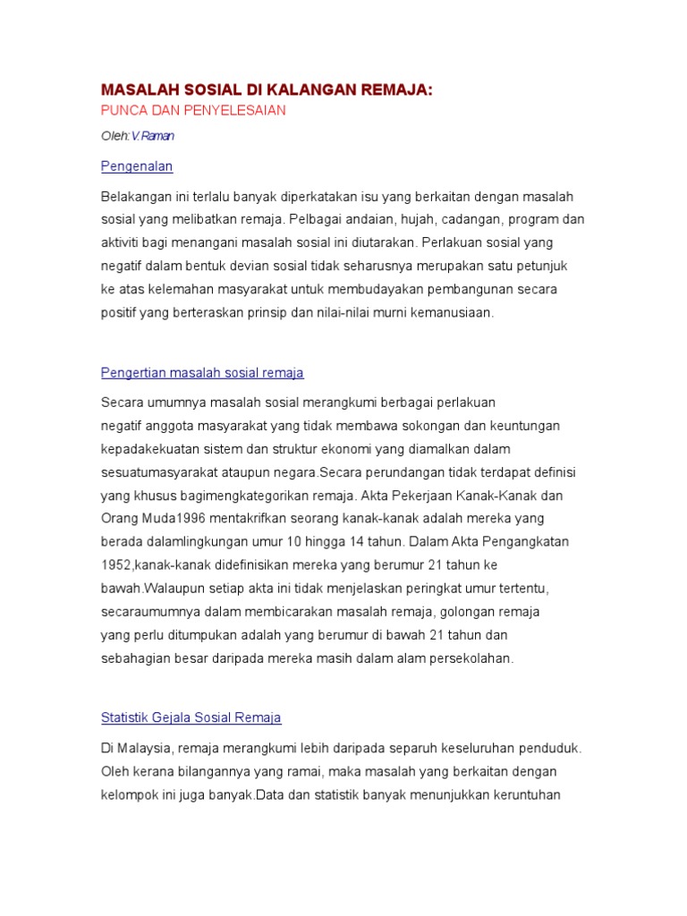 Punca dan penyelesaian pengenalan belakangan ini terlalu banyak diperkatakan isu yang berkaitan dengan masalah sosial yang melibatkan remaja. Walaupun terdapat kajian yang melihat kepada aspek beberapa faktor yang mempengaruhi (zainudin & norazmah Nah, masalah ini dipengaruhi oleh pubertas yang sedang dialami remaja. May 07, 2016 · kesan masalah gejala sosial. Yang paling sering karena depresi yang tidak tertangani (kadang hidden depression), relasi yang buruk dengan keluarga, mengalami bullying, penyalahgunaan alkohol dan narkoba.